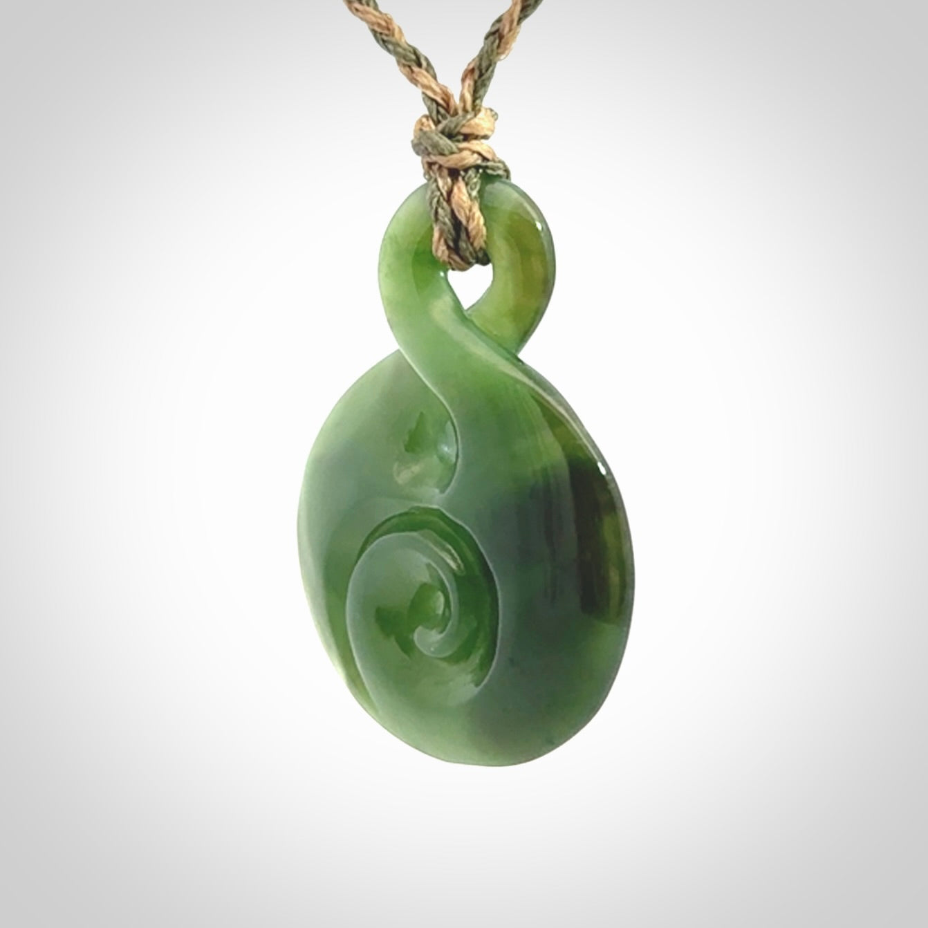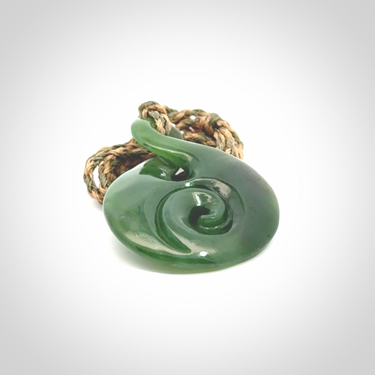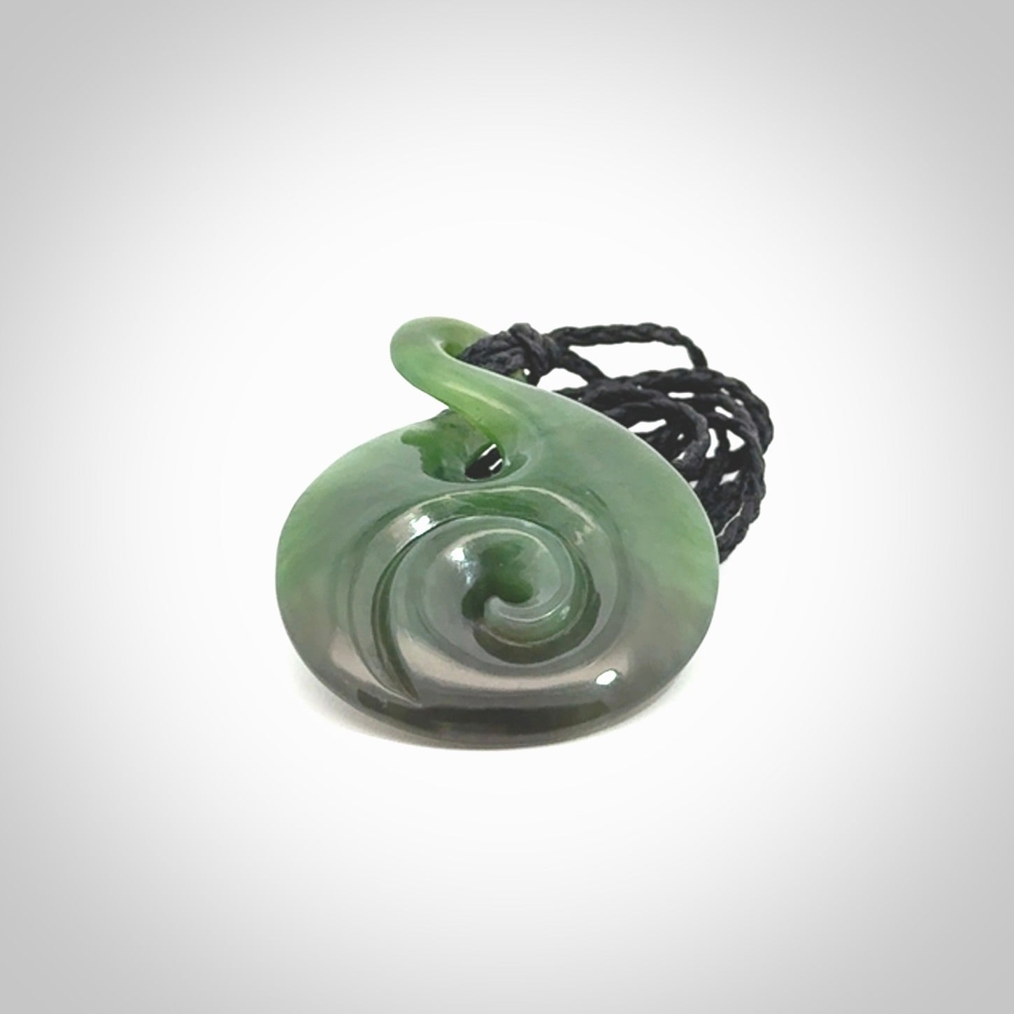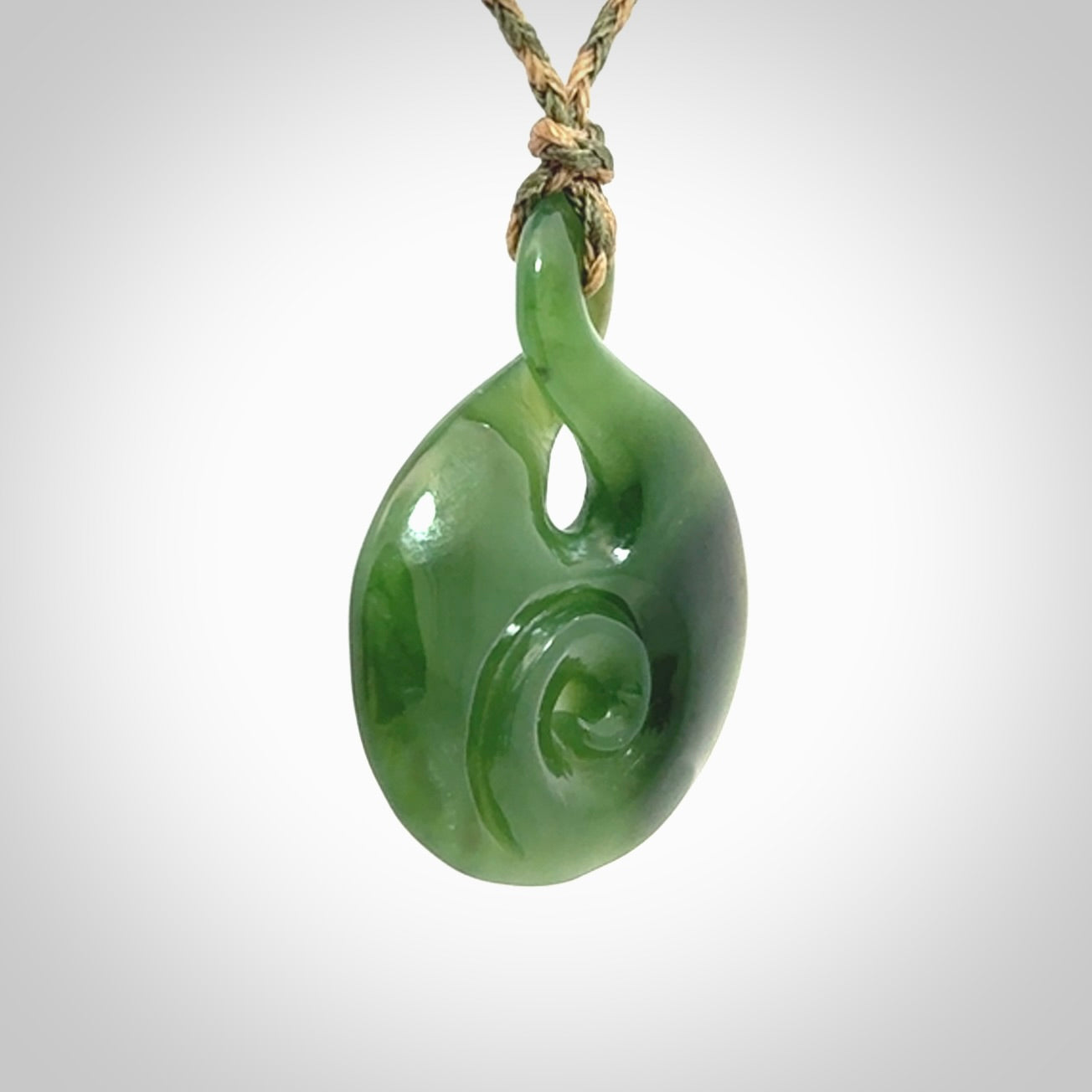 A masterfully carved twist with central koru. This is a self-contained and beautiful pendant.