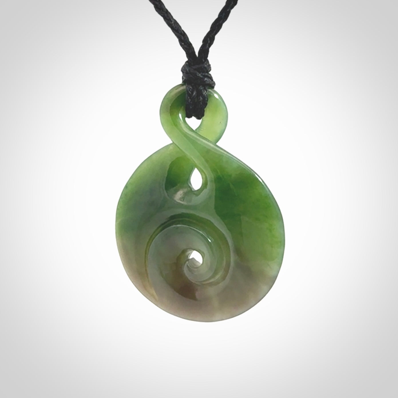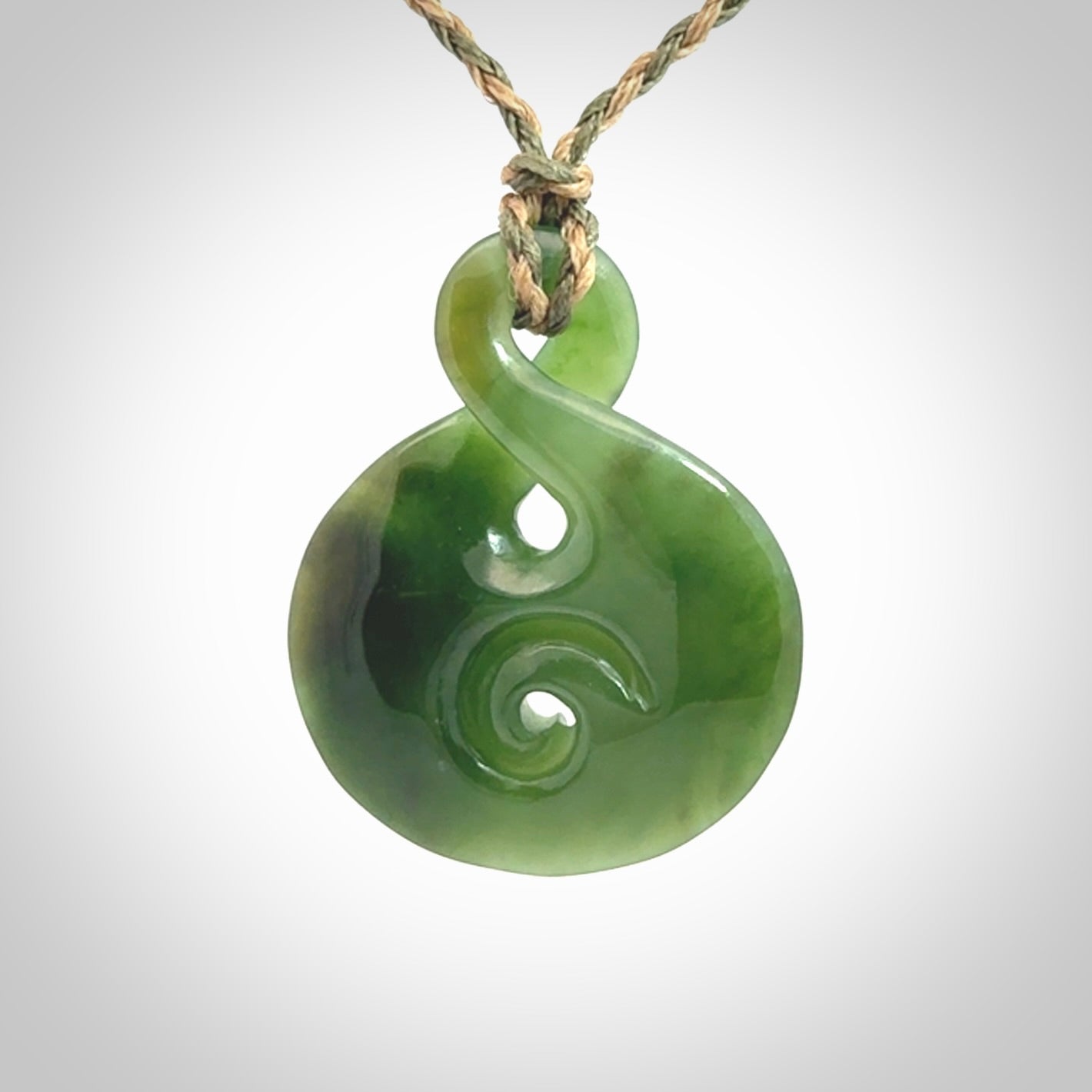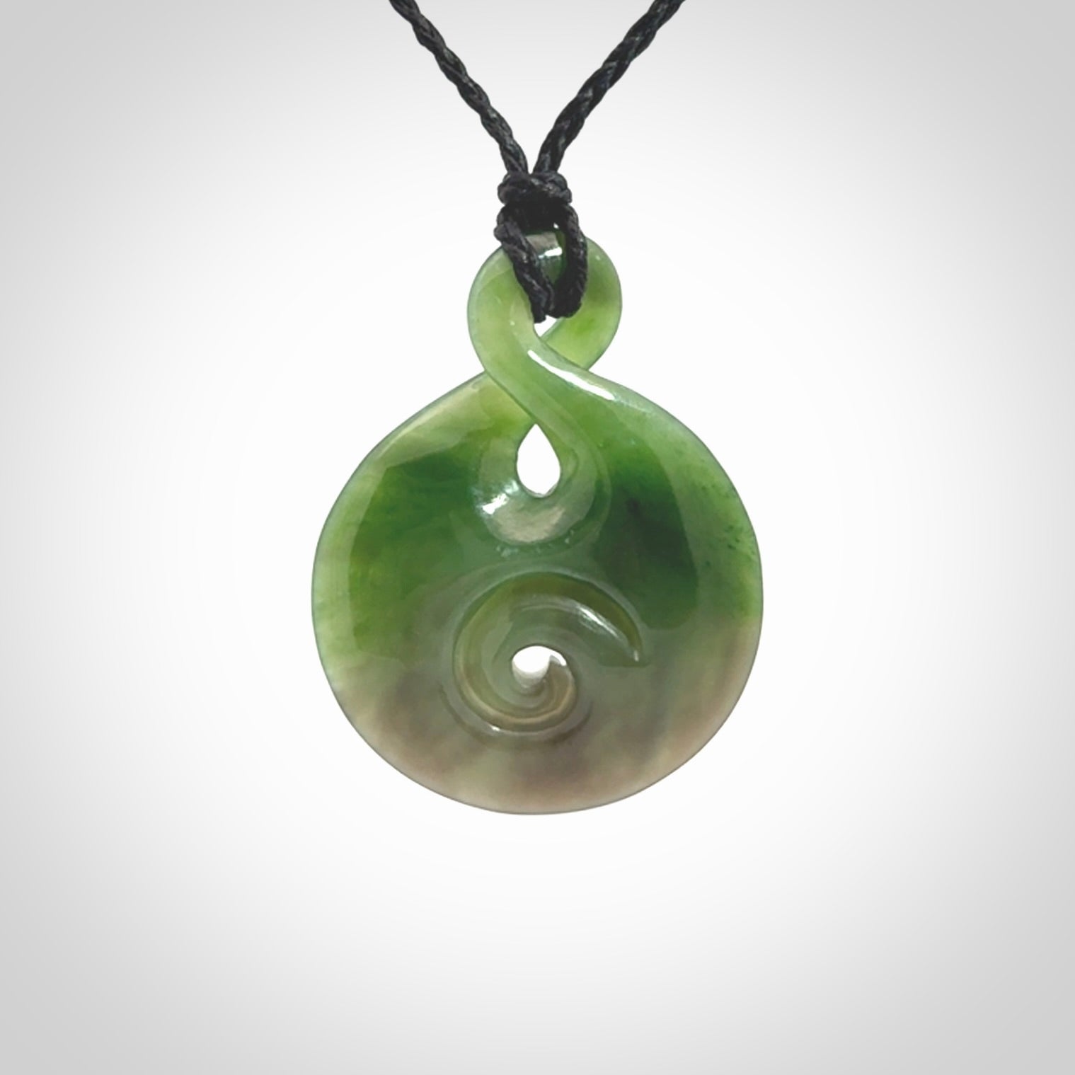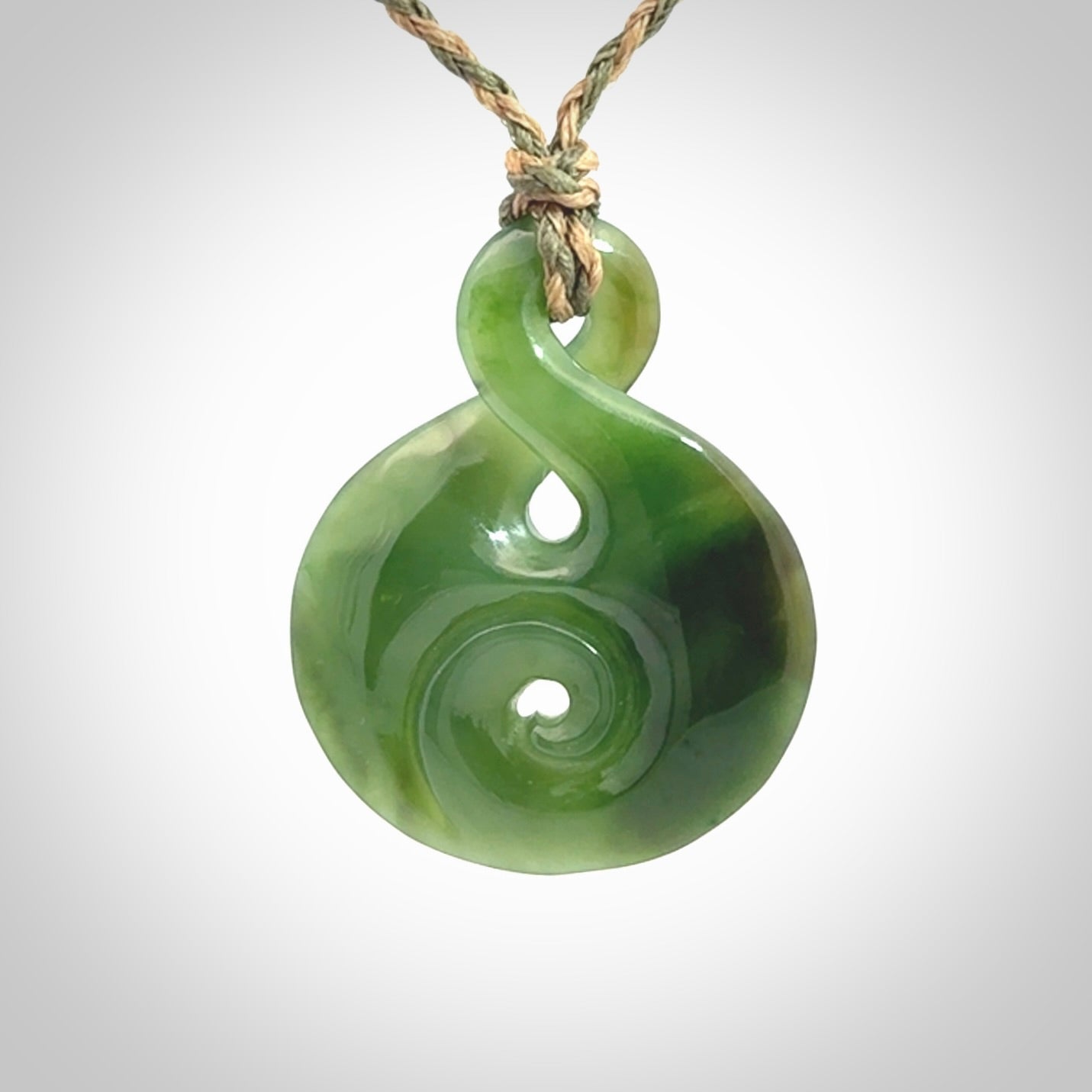 A masterfully carved twist with central koru. This is a self-contained and beautiful pendant.